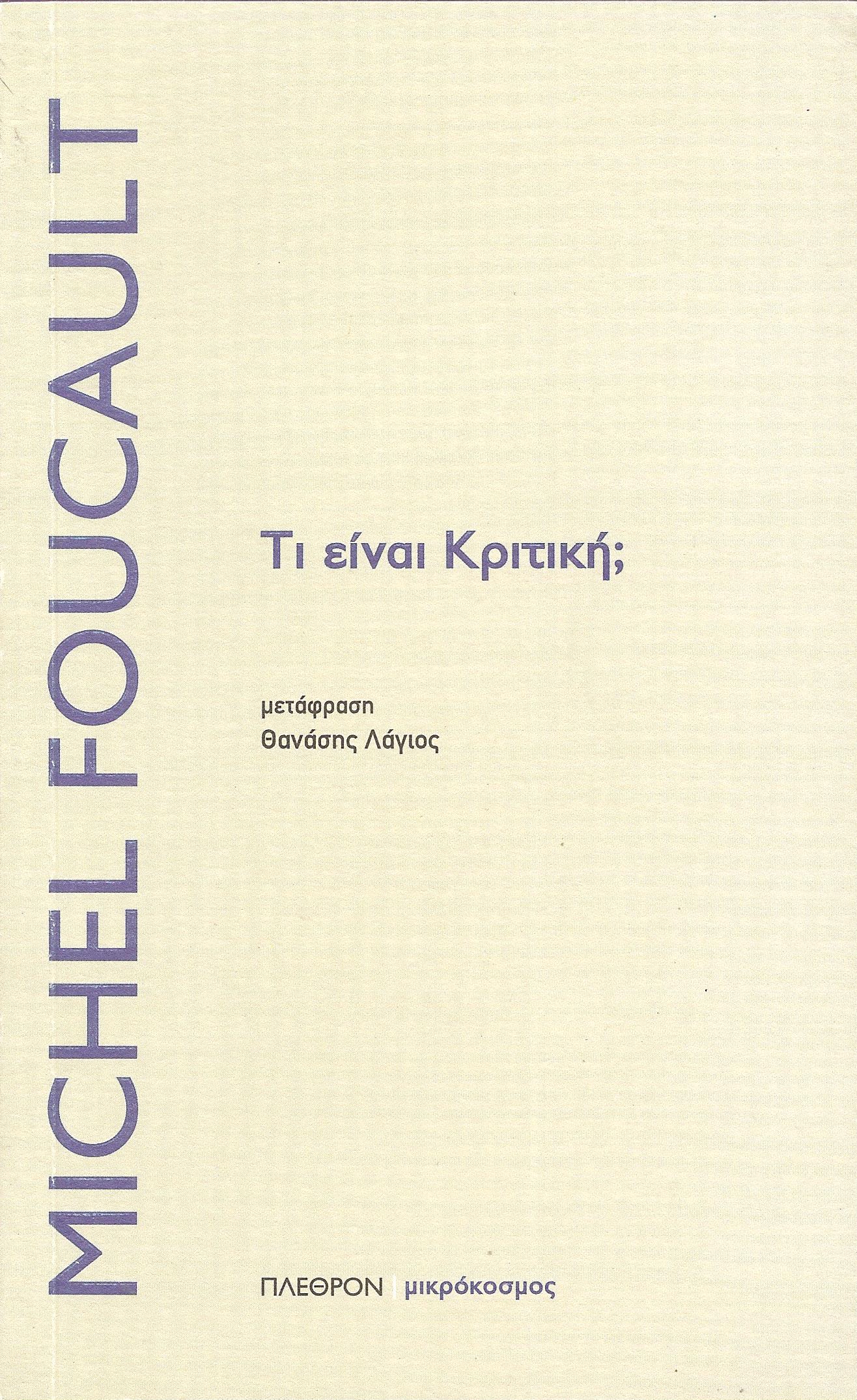 «Στην πραγματικότητα, το ερώτημα, για το οποίο ήθελα να σας μιλήσω και για το οποίο θέλω ακόμη να μιλήσω, είναι: Τι είναι Κριτική; Θα έπρεπε να δοκιμάσουμε να σκεφτούμε κάποιες προτάσεις γύρω από αυτό το σχέδιο που δεν παύει να διαμορφώνεται, να προεκτείνεται, να αναγεννιέται στις εσχατιές της φιλοσοφίας, εντελώς κοντά σ' αυτήν, εντελώς ενάντια της, εις βάρος της, στην κατεύθυνση μιας ελευσόμενης φιλοσοφίας, στη θέση, ενδεχομένως, κάθε δυνατής φιλοσοφίας. Και μου φαίνεται ότι μεταξύ του υψηλού καντιανού εγχειρήματος και των μικρών πολεμικο-επαγγελματικών δραστηριοτήτων που φέρουν αυτό το όνομα της κριτικής, μου φαίνεται ότι υπάρχει εντός της νεώτερης Δύσης (ας χρονολογήσουμε, σε αδρές γραμμές, εμπειρικά, από τον 15ο-16ο αιώνα) ένας ορισμένος τρόπος του σκέπτεσθαι, του ομιλείν, επίσης του ενεργείν, μία ορισμένη σχέση με ό, τι υπάρχει, με ό, τι γνωρίζουμε, με ό, τι κάνουμε, μία σχέση με την κοινωνία, με την κουλτούρα, μία σχέση, επίσης, με τους άλλους, και την οποία θα μπορούσαμε να αποκαλέσουμε, ας πούμε, κριτική στάση».
