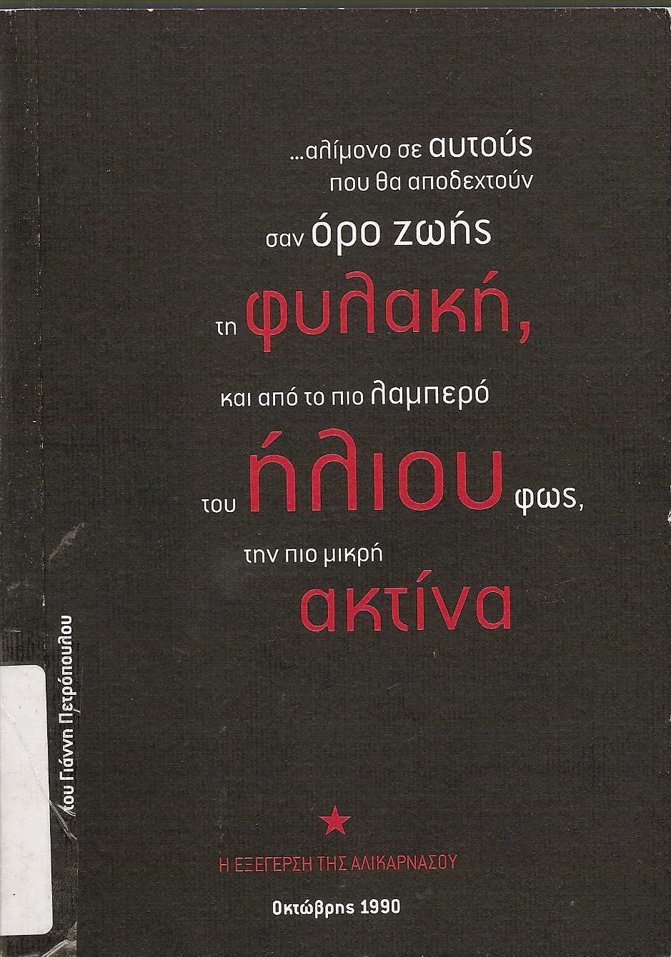 Αυτό, όμως, είναι μονάχα το ένα πρόσωπο του Ιανού. Δεν είναι λίγοι εκείνοι οι αξιόλογοι ποινικοί κρατούμενοι που με συνέπεια μάχονται εναντίον της συνθήκης του εγκλεισμού ή ακόμα και εναντίον της άσχημης πλευράς του εαυτού τους. Δεν είναι λίγες εκείνες οι στιγμές που η αξιοπρέπεια υψώνει το ανάστημά της απέναντι στη καθημερινή βαρβαρότητα. Δεν είναι λίγες οι στιγμές που ακούστηκε ο ήχος της εξέγερσης, ο υπέροχος αυτός ήχος της έκρηξης, των σπασμένων τζαμιών και της καταστροφής της υποδομής της φυλακής. Δεν είναι λίγες οι στιγμές που αναδύεται η αλληλεγγύη και η αφοσίωση στο κοινό αγώνα. Οι στιγμές αυτές του συλλογικού αγώνα που οι φυλακισμένοι διεκδικούν δυναμικά ανθρωπινότερες συνθήκες κράτησης. Πολλά κόκαλα έχουν σπάσει και πολύ αίμα έχει χυθεί, για να γίνει η ζωή των φυλακισμένων λιγότερο βάρβαρη, κάπως πιο ανθρώπινη. Πάνω απ’ όλα, όμως, επειδή μέσα από τους αγώνες αυτούς ξεπηδά το πρόταγμα της καταστροφής των φυλακών ΣΤΗΝ ΠΡΑΞΗ και όχι ως ένα αφηρημένο σύνθημα ή ως ένας απλός λεκτικός μαξιμαλισμός. Κάτι που κατ| εξοχήν εκφράζεται με την εξέγερση της Αλικαρνασσού, όπως μας τη διηγείται στο ανά χείρας βιβλίο ο Γ. Πετρόπουλος. Μια μικρή ιστορία αγώνα και ανθρώπινης αξιοπρέπειας μια χούφτας αποφασισμένων φυλακισμένων, απέναντι σε έναν πάνοπλο κατασταλτικό μηχανισμό.