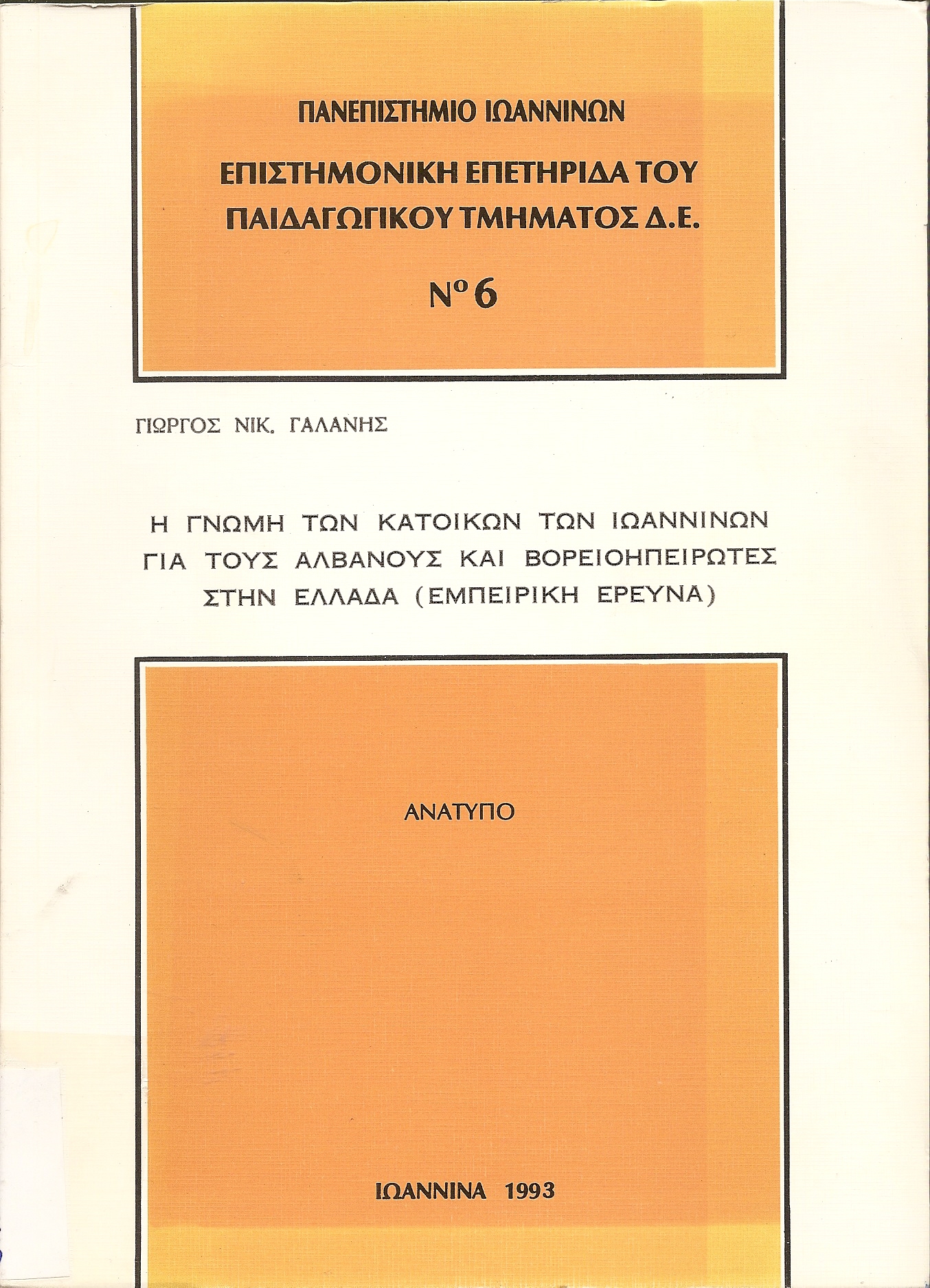 Παρουσιάζονται τα πορίσματα έρευνας που διεξήχθη κατά το χρονικό διάστημα από τον Ιανουάριο 1992 μέχρι τον Μάρτιο 1992 στην πόλη των Ιωαννίνων, βάσει ερωτηματολογίου με στόχο την ανάλυση της στάσης των ερωτουμένων προς τους Αλβανούς και τους Βορειοηπειρώτες και τους παράγοντες που την επηρεάζουν. Περιέχει αναλύσεις μεταβλητότητας απλής και διπλής κατεύθυνσης και συγκρίσεις μεταβλητών με την βοήθεια των στατιστικών κριτηρίων t-test groups, Chi και t-test pairs. Διατυπώνονται 21 συνοπτικά συμπεράσματα που επιβεβαιώνουν την υπόθεση ότι η στάση των ατόμων του δείγματος είναι περισσότερο αρνητική προς τους Αλβανούς παρά προς τους Βορειοηπειρώτες στο γνωστικό, συναισθηματικό και ψυχοκινητικό επίπεδο.